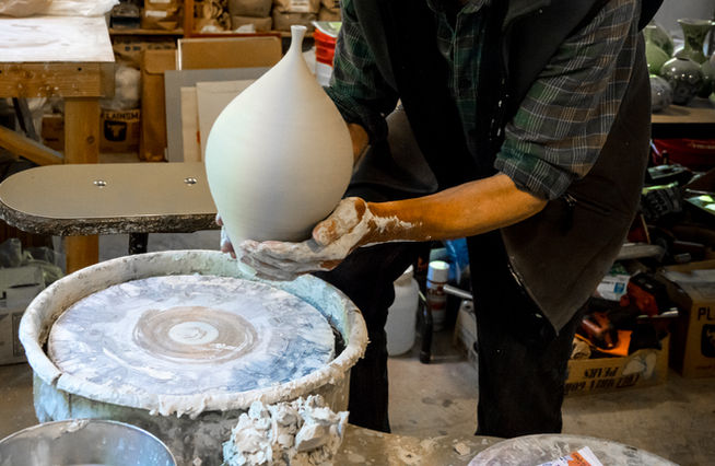 Unlike the constant speed of an electric wheel, the speed of a kick-wheel constantly slows as one lifts the wall of a piece. This makes throwing a large pot more difficult, as I like to finish a lift before the wheel slows too much. In practice, this means that each lift must start with the wheel spinning at a pretty good clip, then slowing to a crawl as the lift nears the rim of the piece, all the while keeping the surface finger marks as even as possible. I believe the extra challenges involved with the use of a kick-wheel can teach the potter a lesson or two about improving their throwing skills.